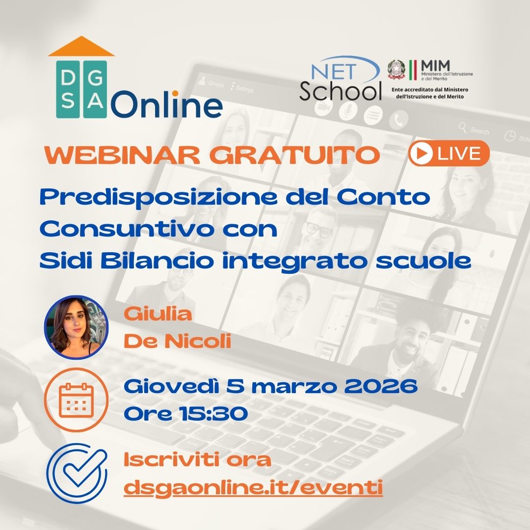 Un webinar operativo dedicato al Conto Consuntivo che grazie alla guida esperta di Giulia De Nicoli accompagnerà Ds e Dsga delle istituzioni nella predisposizione degli atti fino ai controlli che più spesso generano rilievi e richieste di integrazione usando l’applicativo SIDI Bilancio